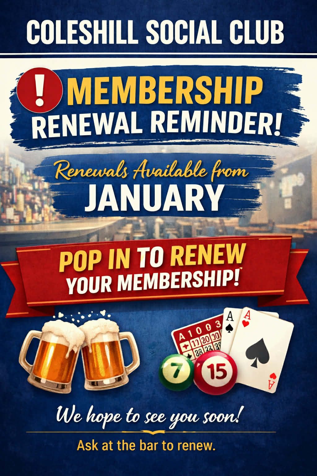 We meet at the Coleshill Social Club Wednesday evenings at 7:30pm.
